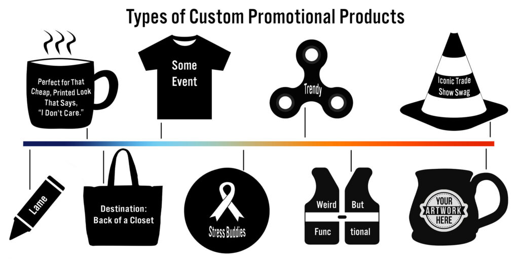 Promotional products are items customized with your brand or logo. They can range from being very cheap and designed for use at events or higher quality as gifts for clients. Likewise, some products—like hipster-friendly fanny packs—stand out more than others—like T-shirts or water bottles.