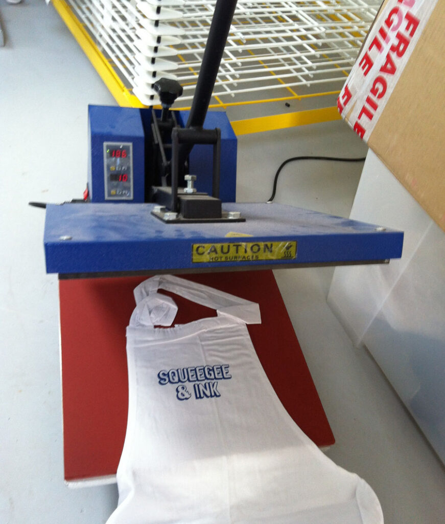 Heat press with apronThere’s a huge array of options for heat transfers, all of which start with special heat transfer paper or vinyl. The decorator puts your promotional product onto the heat press and centers your logo, printed or cut from transfer paper or vinyl, before lowering the top of the press onto the shirt. The heat binds the design to the shirt or bag; and with that, it’s finished.