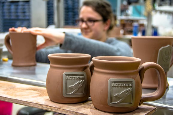On the base of every handle that Sunset Hill Stoneware makes for its stoneware coffee mugs and beer steins, you’ll find a thumbprint where our artisans have attached that piece. The Sunset Hill Stoneware employees leaving these thumbprints also apply the medallions to your unique mugs.