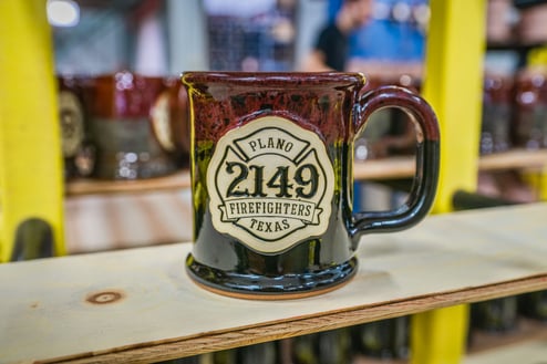 Plano Firefighters Association first asked us about making mugs for a fundraiser. We adapted the union’s logo into a medallion that would look bold on just about any glaze color. Its premiere design was an Executive Slim mug in Lava Rock, a glaze based in midnight black and topped with deep red that was well-suited to the people the organization supports.