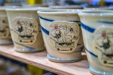 Fred is a veteran of the United States Marine Corps. So, the Sunset Hill Stoneware crew worked with him and Channell to create something symbolic for Memorial Day 2019. Their designer, Joey Hetzel, developed a design in the shape of a military dog tag, with a distressed American flag, burial crosses and symbolism unique to the U.S. Marine Corps. The mugs featured two new glaze colors for us; the tricolor Old Glory and Desert Cactus, a shade based in Oatmeal and topped in green.