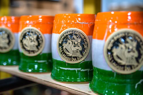 This Irish phrase means, “May God not weaken your hand”. When Iron Bean Coffee Company debuted this stein in the colors of the Irish flag and Royale Moss, they did it to thank their community. The original featured green, white and orange, while the Royale Moss version represented the traditional colors of St. Patrick. At 24 oz., these might seem pretty large for coffee mugs. But, these custom mugs can hold just about anything, including your favorite stout or other drinks.