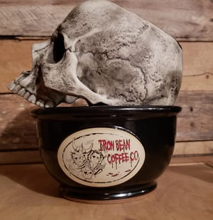 The Bean 2.0 mug with logoFeatured in our Silvery Night and Cranberry Bog glazes, these uniquely shaped mugs flaunt Iron Bean’s skull and crossbones logo on the medallion and flew off the shelves in their first two iterations.