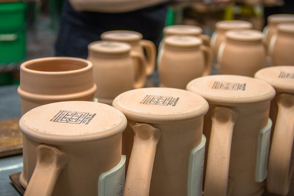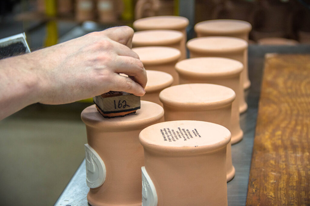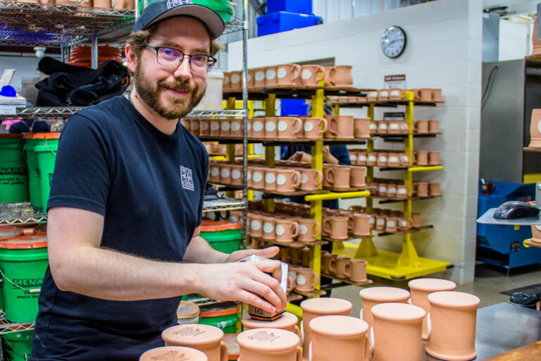 Mike and the rest of our team apply these stamps with potter’s ink, which withstands the heat of our kilns. Once they’ve applied the stamp, they seal the bottom of the mug with wax so the stamp is still visible after we finish firing it.