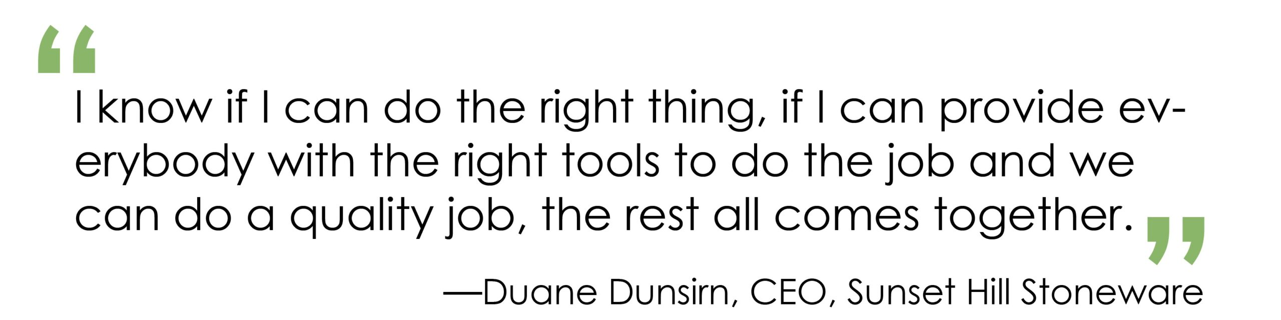 Today, Duane also works at HawkPoint Technologies, which supplies the MRP system that allows our company to reduce our paper usage by hundreds of pounds every year. He’s always looking for ways to improve the systems Sunset Hill Stoneware uses to assure quality and safety.
