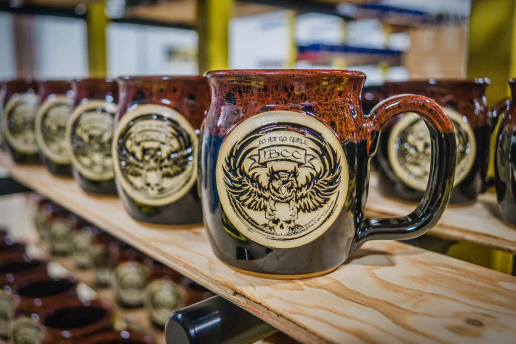 The Bean series is a prime example of this. Every Daybreaker mug they’ve ordered from Sunset Hill has featured their skull logo. It also often includes trailblazing glazes like Brimstone, or our very first black medallions. Even though it’s one of the simpler designs that Iron Bean uses with us, there’s a subtle message about their brand in each piece: They aren’t afraid to push the envelope and go where others fear to tread.