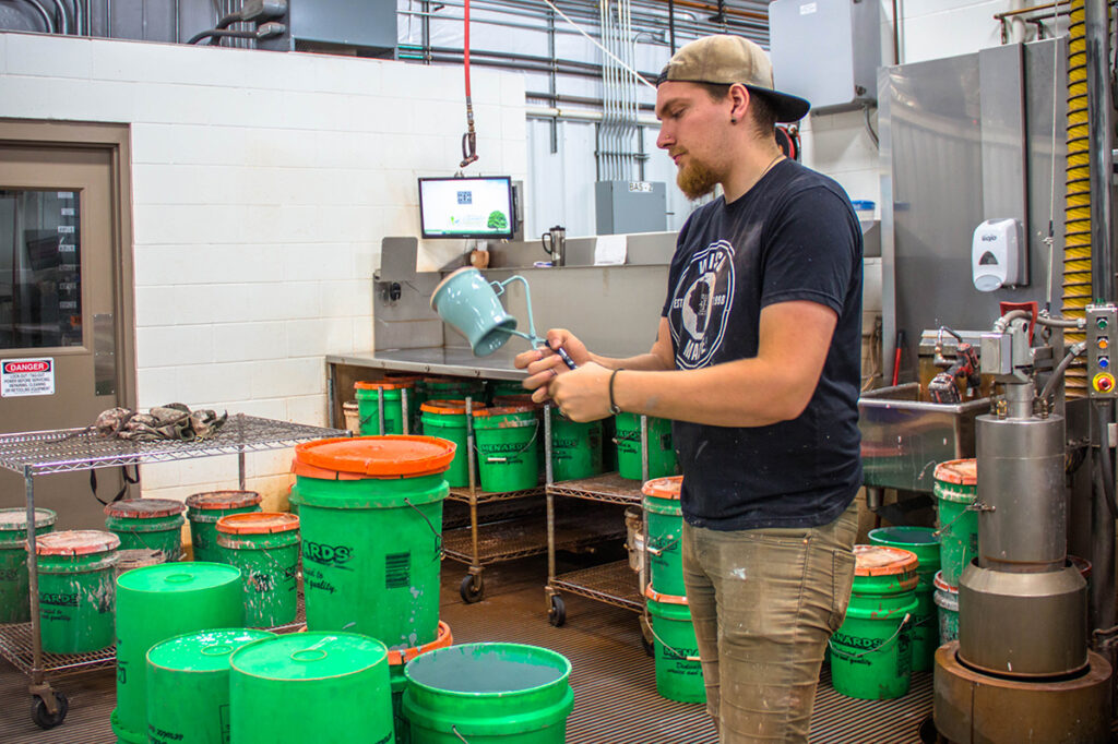 In our case, some of our glazes are solid colors, so our glazing team only has to dip them in the liquid mixture once. But, since we have glazes with two colors or even three, our crew sometimes has to dip the stoneware multiple times to get the desired finish. Some mugs might also need to spend more time in the glaze, depending on how thick or thin the liquid is.