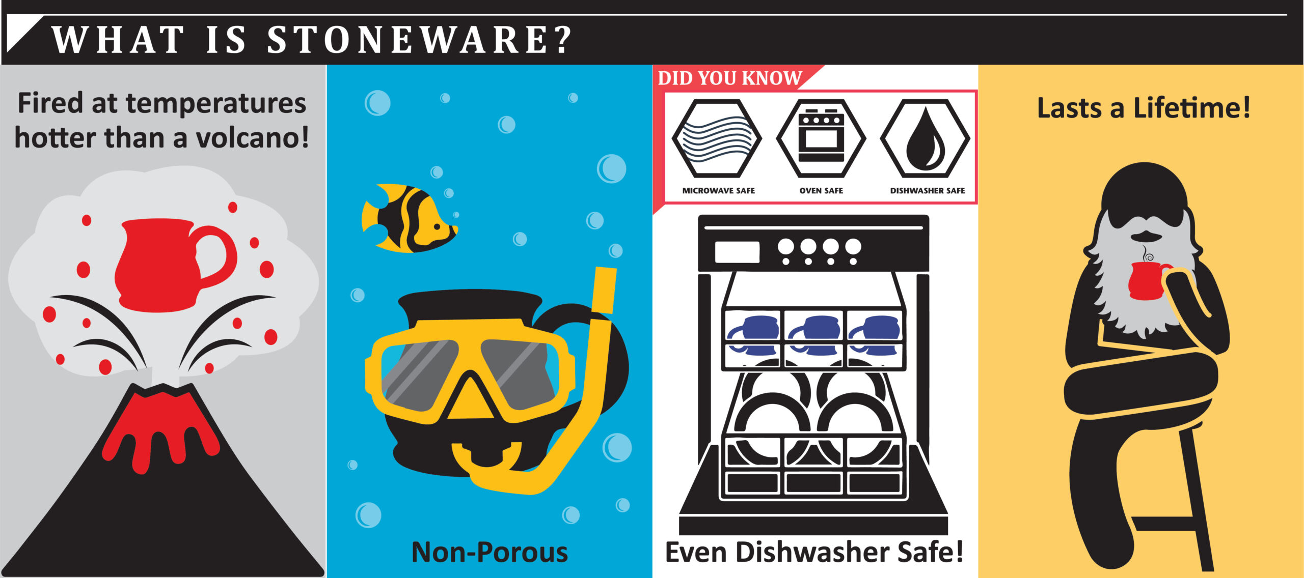 Stoneware pottery is strong, hard and nonporous. It’s durable, elegant and versatile; capable of being anything from a customized trophy to a baking dish. In our case, it can also stand up to the heat from a microwave, dishwasher or even an oven under the right conditions. Stoneware also distributes and retains heat more evenly than other types of pottery, so it’s perfect for drinking coffee or tea.