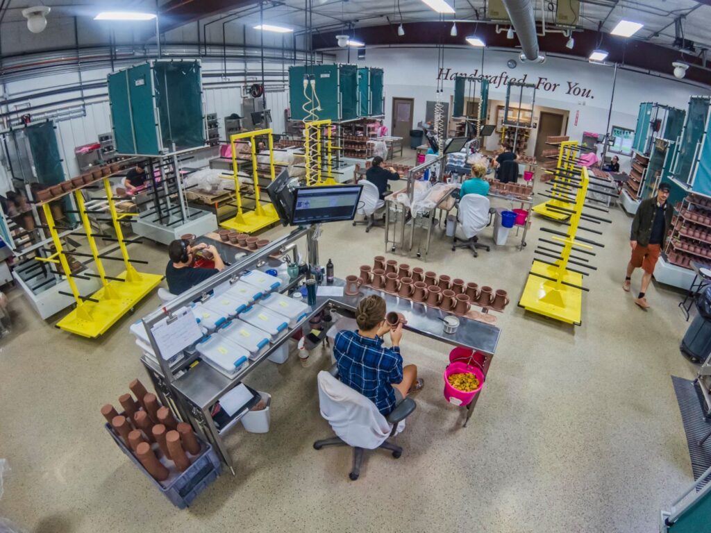 The drying process usually requires us to wait overnight, if not longer. That being said, we are lucky enough to have a custom HVAC system in our shop that takes all the guesswork out of the drying process. At most smaller pottery studios, the process completely depends on mother nature. Depending on the time of year and the weather outside, it could take days for these studios’ mugs to dry out enough for the bisque firing process. Sometimes, they will use standing fans to make the mugs dry faster, but this can cause uneven drying.