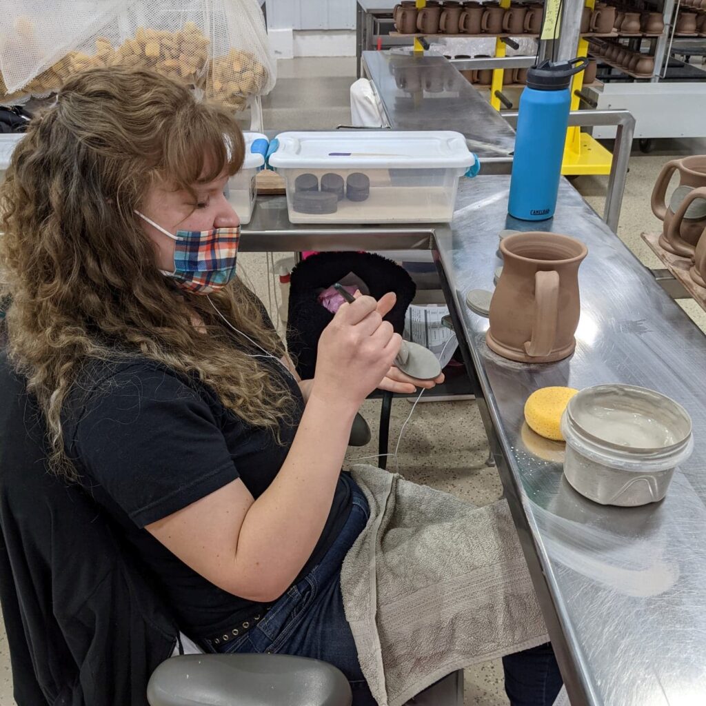 We have a few top-secret tricks up our sleeves for keeping the mugs workable while they wait. Luckily, our handlers also work quickly to apply each handle and medallion with a layer of slip to bind them together into one piece. Overall, it typically takes our handle and medallion team just under two hours to complete both phases on your 48 mugs. However, if you decide to order SwirlWare or want two medallions on your mugs, it might take a little longer. That also doesn’t consider whether your mugs have to wait while other orders receive the same treatment so production keeps running smoothly with no bottlenecks.
