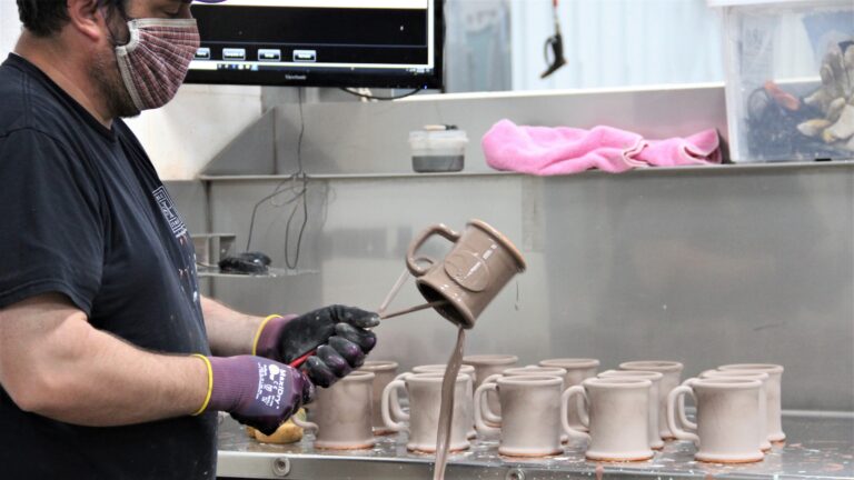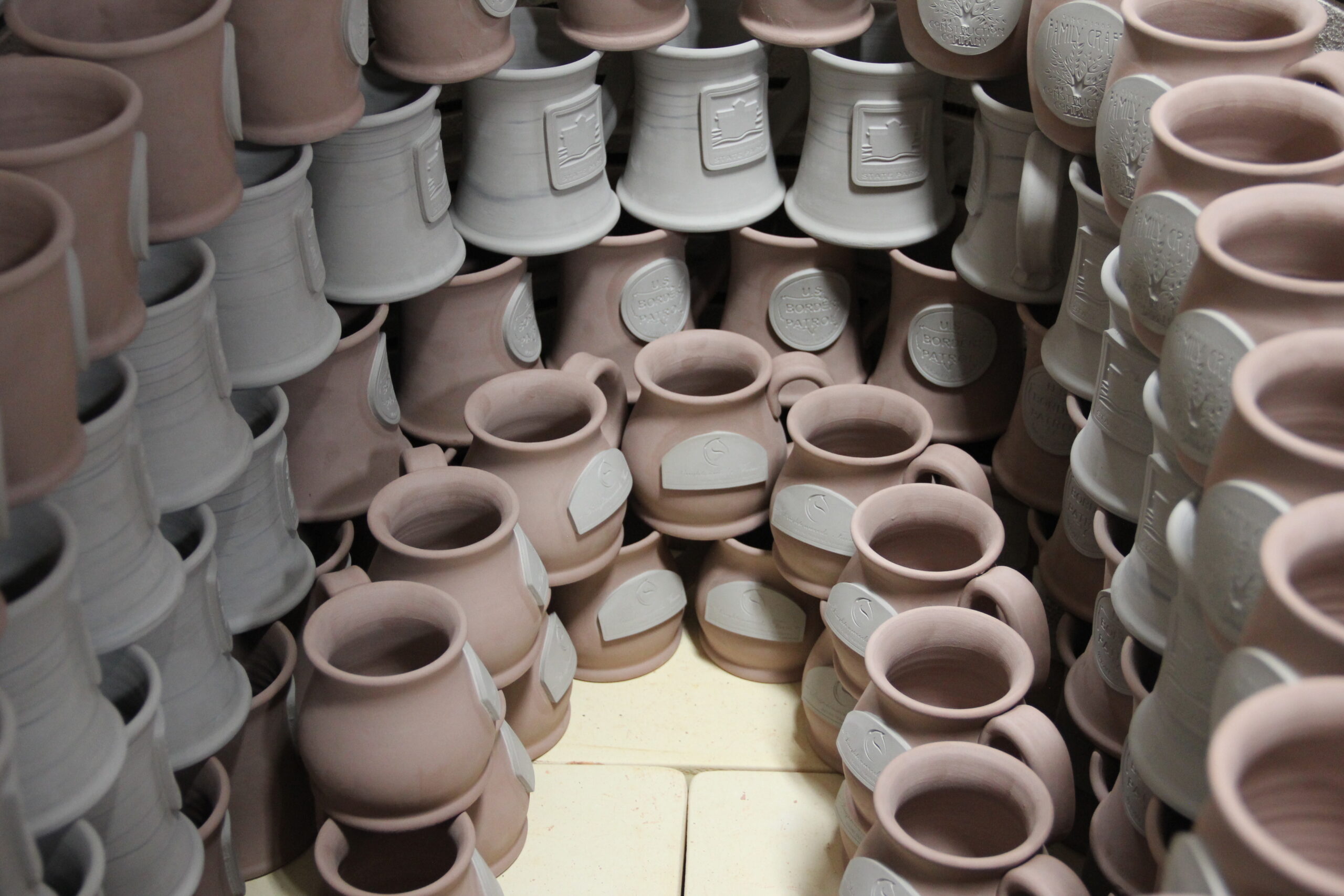 After the mugs have a body, they must next get their handle and medallion. Timing is everything in this step. If our mugs stay out in the open too long while they’re waiting for their handles, they could dry out too quickly. Letting this happen puts your mugs at risk for broken handles and medallions later on.